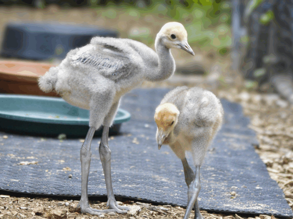 The National Aviary’s adult bonded Demoiselle Crane pair, Niles and Daphne, partnered together in 2017, residing outside in the Aviary’s Condor Court. Although the two make a strong genetic match, they have not been able to produce fertile eggs to this point. Surrogacy offered them the unique opportunity to be first-time parents! The Aviary Crane chicks’ dedicated neonatal care team includes aptly named Senior Aviculturist Brianna Crane and Assistant Manager of Animal Care Sylvia Ronquillo, who personally transported the fertile eggs from quarantine at ICF to their new home at the Aviary. The first egg was incubated and hatched by mom, Daphne, in Condor Court, while the second was hatched and hand-raised by Brianna in a behind-the-scenes breeding center, before joining the rest of its family in the public-facing habitat.
